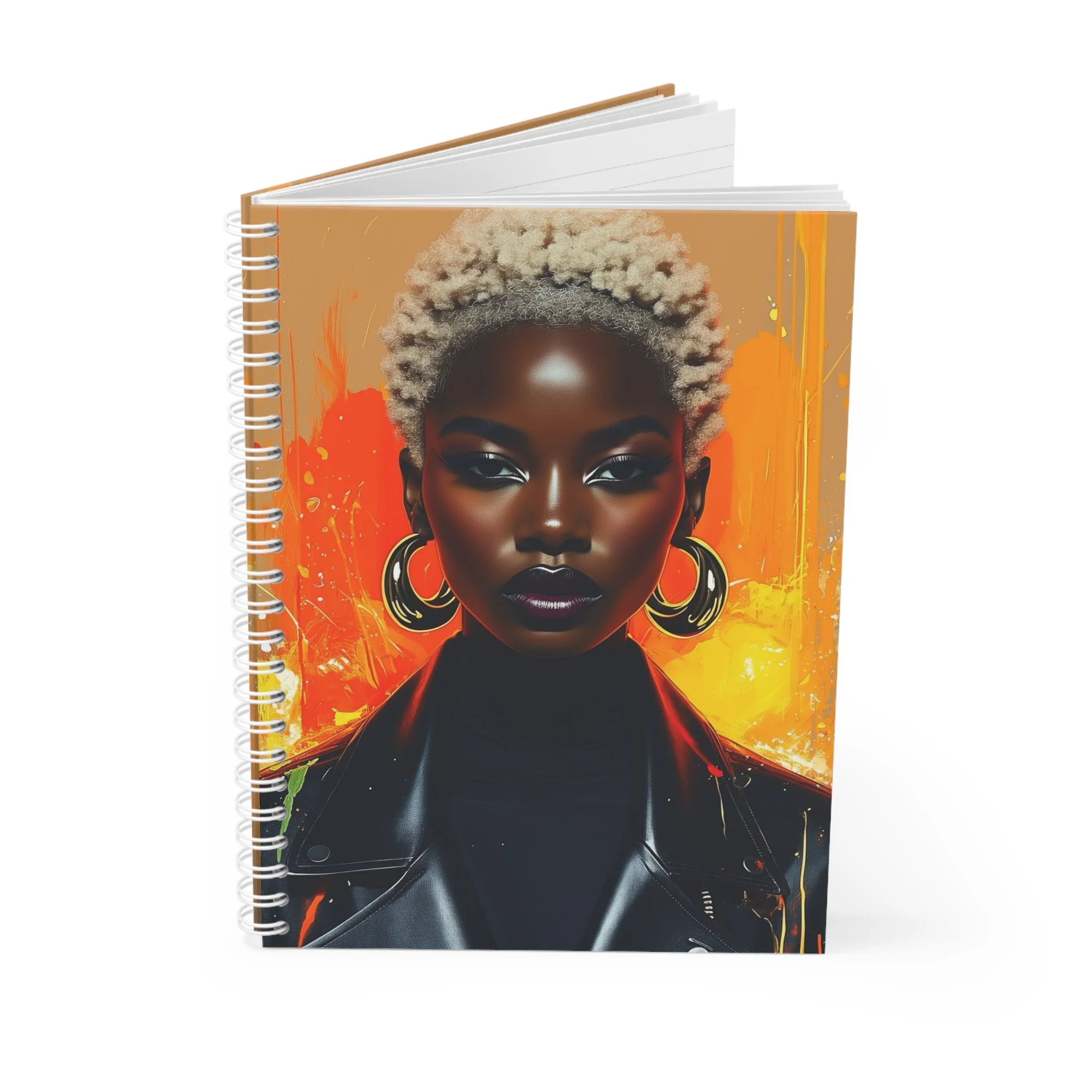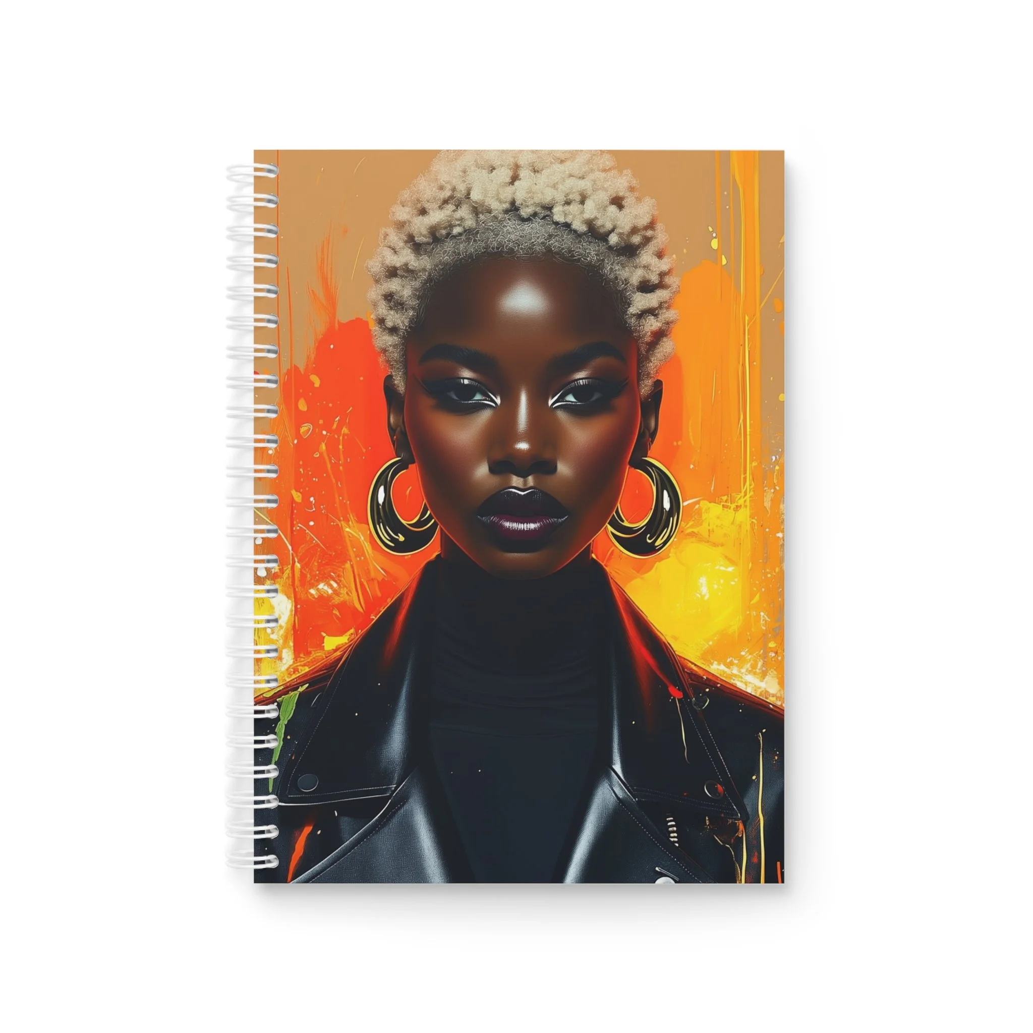 This spiral notebook pairs bold, contemporary portrait art with everyday utility. The semi-gloss laminated cover showcases a vibrant, high-contrast illustration that feels fierce and intimate — warm amber and flame-orange strokes halo a poised, stylish figure. Inside, 128 ruled pages on 90gsm paper take ink and pen smoothly, while the white metal spiral lets you flip or remove pages without fuss. Use it as a daily journal, sketchbook for written ideas, or a place to draft creative projects; the strong cover and crisp printing keep your notes looking as thoughtful as the art that inspires them.